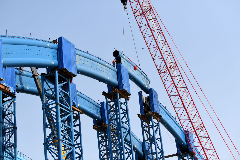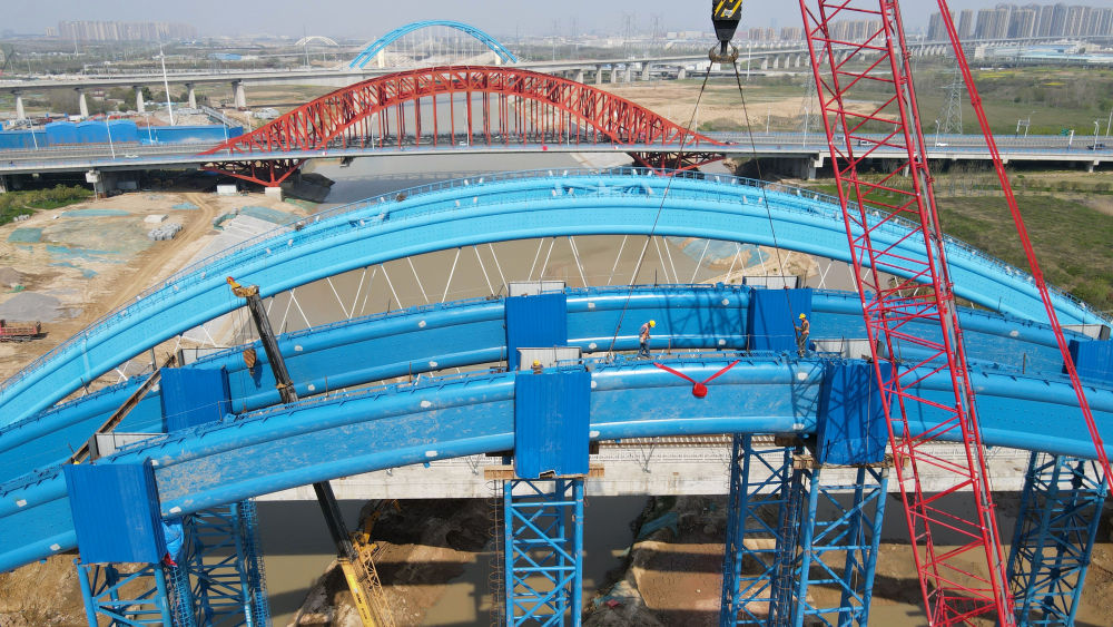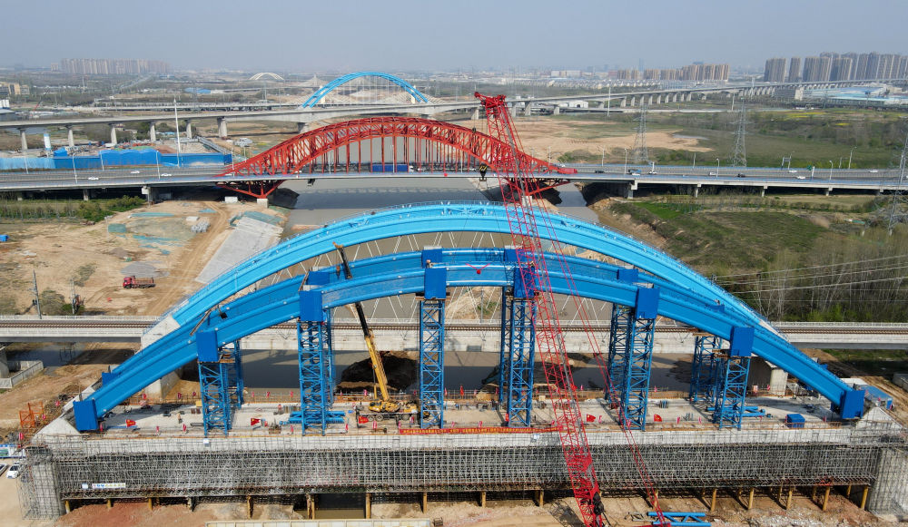 ↑這是中鐵四局引江濟(jì)淮合九鐵路改建工程特大橋系桿拱合龍施工現(xiàn)場(chǎng)(4月2日攝)。新華社記者 劉軍喜 攝影報(bào)道