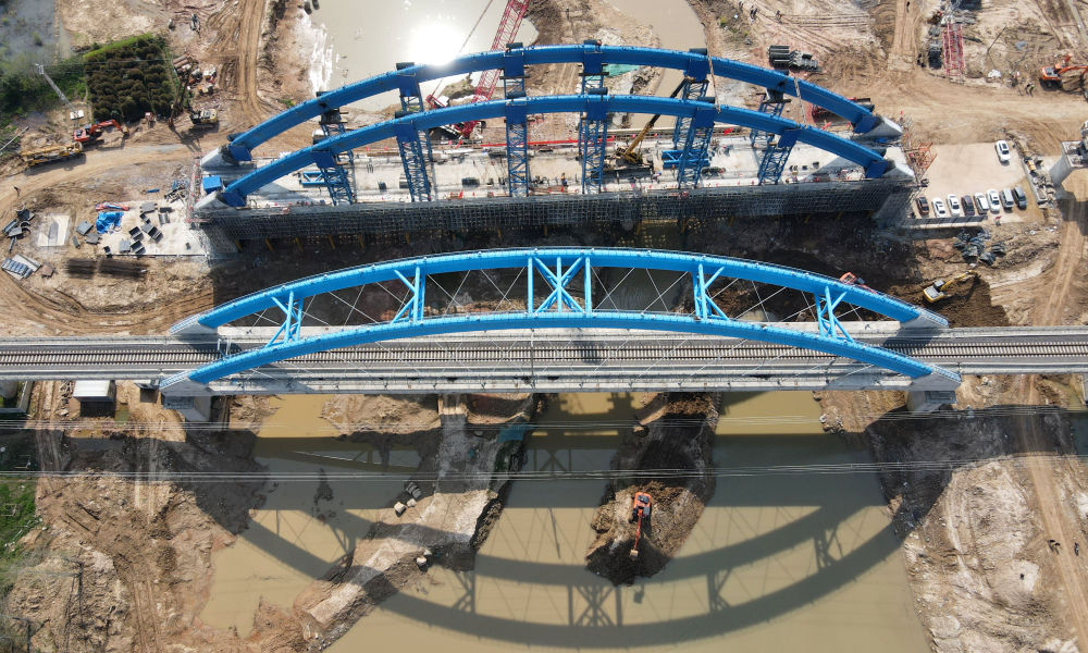 引江濟(jì)淮合九鐵路改建工程特大橋系桿拱合龍